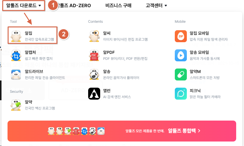 2. 알툴즈 공식 사이트에 접속이 되었으면 알집을 선택합니다.