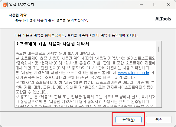 3. 알툴즈 사용권 계약 내용 동의 창이 나타납니다. 또 한번 동의를 클릭합니다.