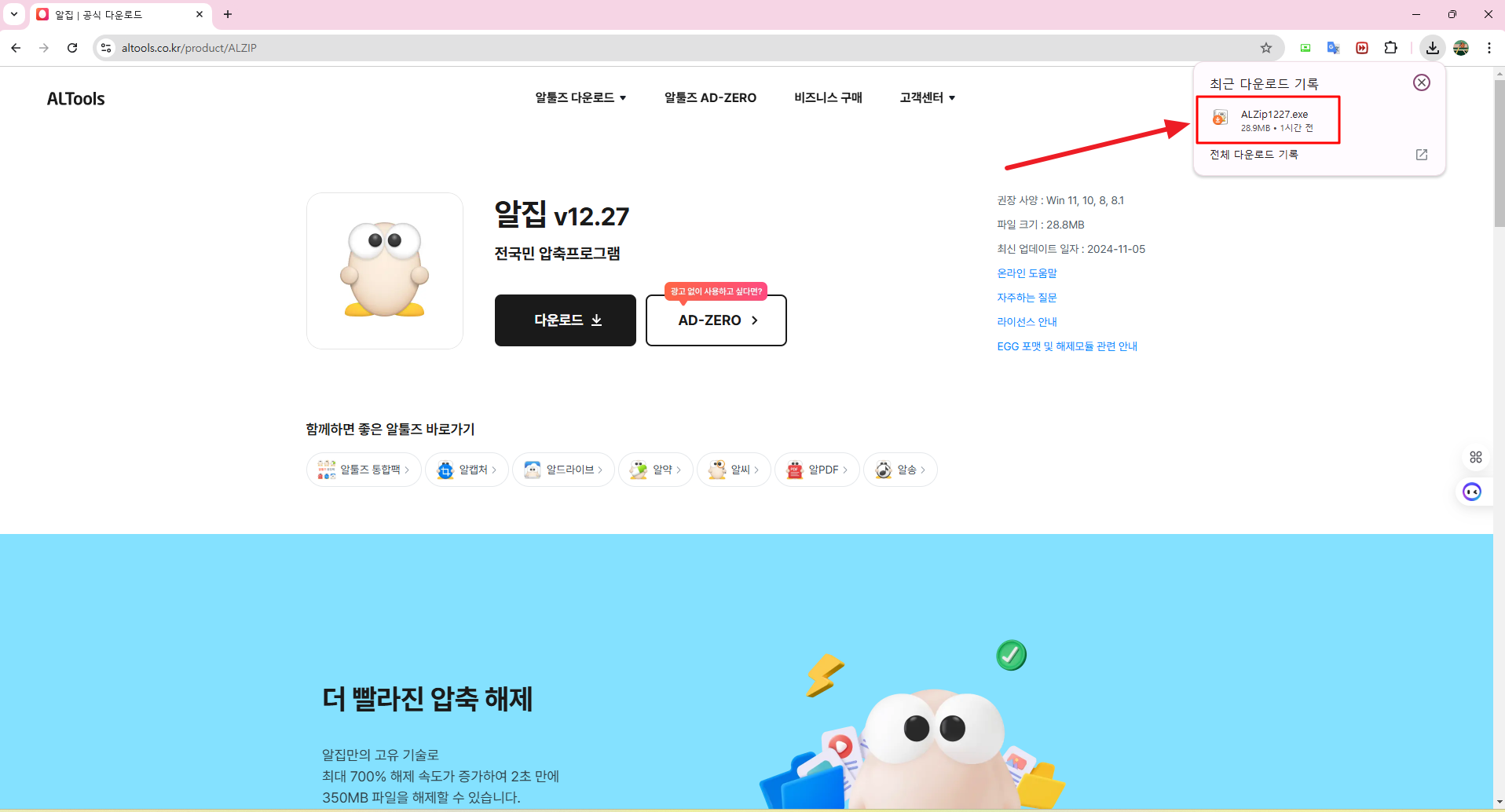 4. 페이지 우측 상단의 알집 프로그램을 클릭하면 알집 설치가 시작됩니다.