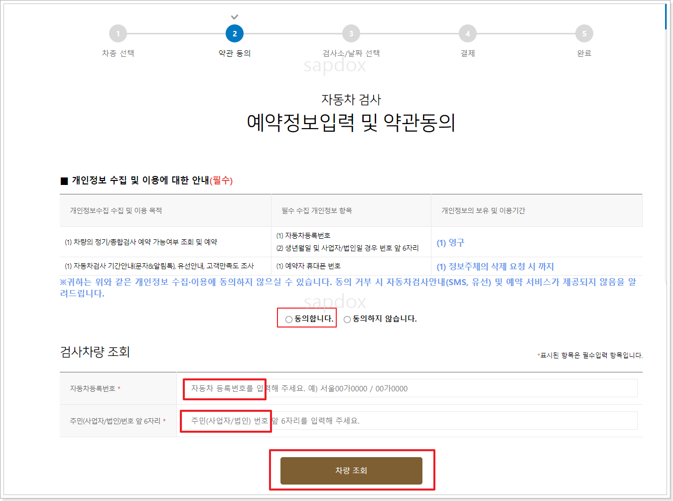 2.4. 자동차 등록번호와 주민번호 앞 6자리를 입력후 '차량 조회'를 클릭합니다.
