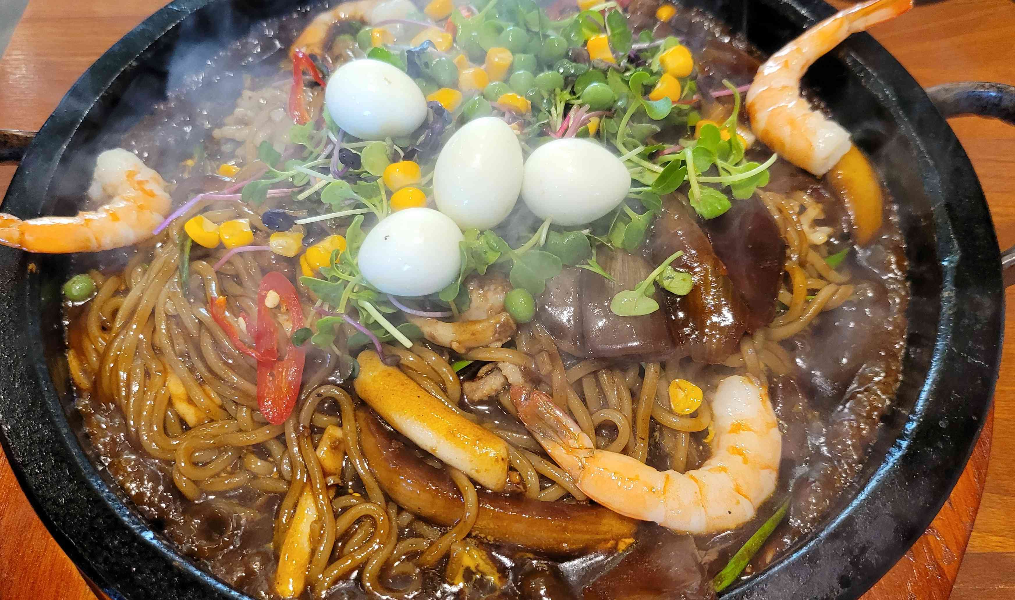 창원 다호리 맛집인 주남저수지돌짜장은 돌짜장(25.0)과 매운갈비찜(33.0) 단 두가지 메뉴만 있는 곳으로 돌판에 나오는 돌짜장은 고기와 해물이 듬뿍 들어간 짜장입니다. 돌판에서 먹게되면 드실때마다 새로운 맛을 즐겨보실 수 있는 메뉴입니다. 식전 음식으로 함께 나오는 파전 또한 겉은 바삭하고 속은 촉촉해 맛있게 즐기실 수 있습니다.