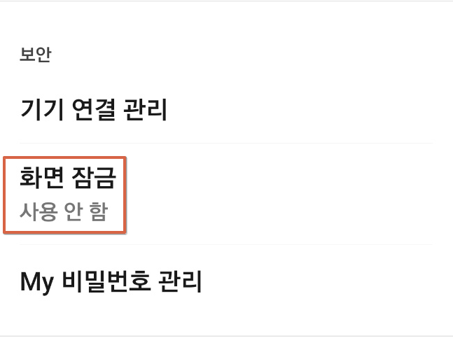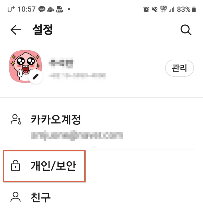 3. 전체설정 메뉴에서 카카오톡 비밀번호 설정을 위해 개인/보안 메뉴를 터치한후 화면 잠금 메뉴를 선택합니다.