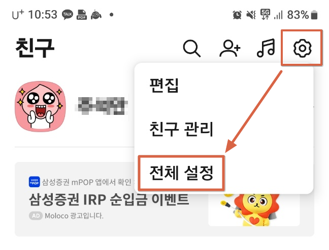 2. 우측 상단 톱니바퀴 터치 후 전체설정으로 진입