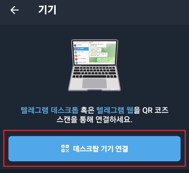 4. '데스크탑 기기 연결'을 선택한 후 컴퓨터 모니터의 QR코드를 스캔해주면 텔레그램 PC버전 다운로드부터 설치까지 모든 과정이 완료됩니다.