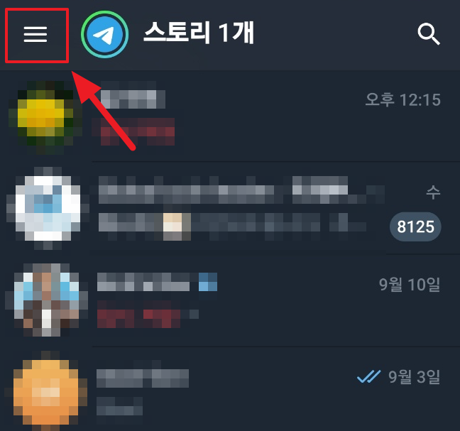 1. 텔레그램 모바일 앱에서 좌측 상단의 햄버거 버튼을 선택합니다.